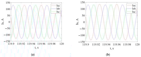 - The asymmetry in the power supply system has a greater effect on the torque ripple and the imbalance of the stator phase currents than the asymmetry of the stator windings. With a deviation of the phase voltage of one of their phases by 2%, the torque ripple coefficient for a scalar control system was 40%, the unbalance coefficient of the stator phase currents was 14%. With a vector control scheme, the torque ripple coefficient was 34.5%, and the unbalance coefficient of the stator phase currents was 17%. With a deviation of the impedance of one of the phases by 10%, similar parameters for scalar control were: torque ripple coefficient—18%, stator phase current imbalance coefficient—4.5%. With vector control: torque ripple factor—15, 5%, unbalance factor of stator phase currents—1.5%.