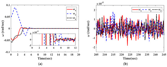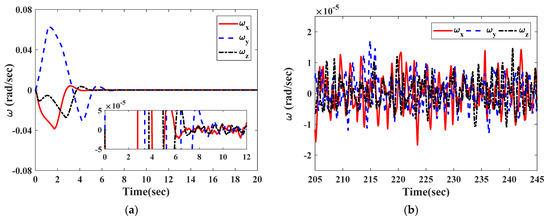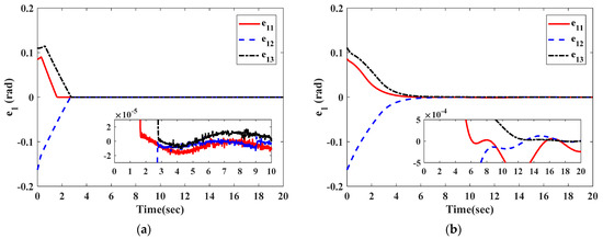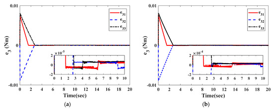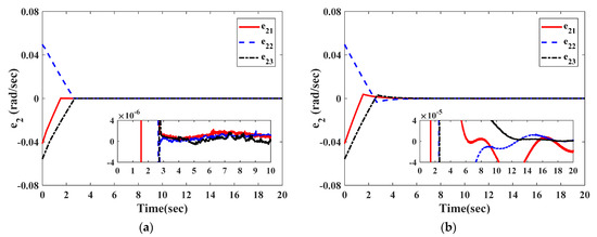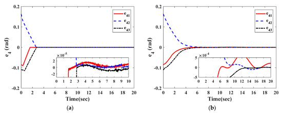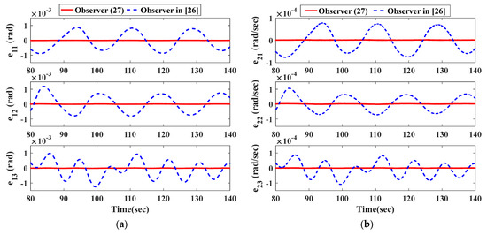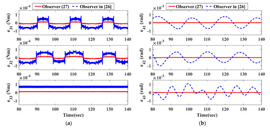 The curves in Figure 2 and Figure 3 illustrate the time response of attitude estimation errors and angular velocity estimation errors by two observers. It can be clearly seen from Figure 2 and Figure 3 that the observation errors of and under the observer in Equation (27) can respectively converge to and within 2.8 s; the observation errors of and under the observer in [26] can respectively converge to and within 16 s.