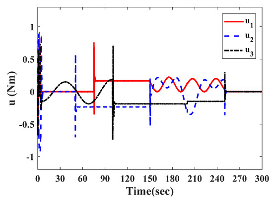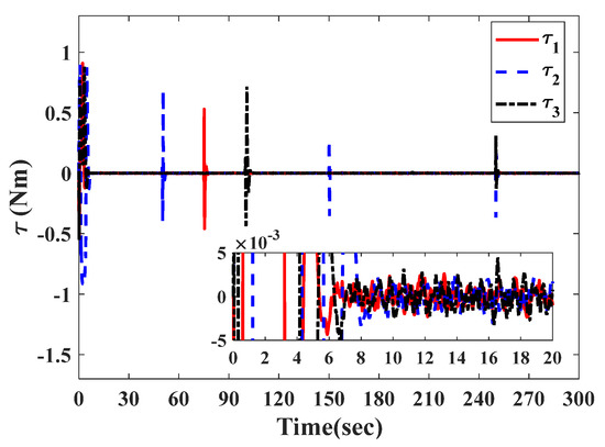 To verify the applicability of the observation method, the actuator faults are redefined in this section. The sensor faults follow Equation (57). Due to the accurate reconstruction of the actuator and sensor faults supplied by Equation (27), the controller in Equation (41) can completely compensate for the effects of actuator and sensor faults. The accurate attitude information can be obtained. Thus, the controller can guarantee the asymptotic stability of satellite attitude and angular velocity. The actuator faults are selected as follows: