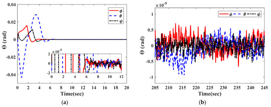 For the given faults, the controller in Equation (41) gives the actuator commanded control torque, as shown in Figure 9. It is clearly seen from Figure 9 that the controller effectively compensates for the actuator faults in a short time. As the time response behavior is shown in Figure 10, the total torque acting on the satellite attitude control system reaches the steady state within 8 s. Figure 11 and Figure 12 show the responses of the estimated attitude and the estimated angular velocity driven by the VSFTC (Equation (41)). The estimations of and converge to and within 9 s. Figure 13 and Figure 14 show that the actual attitude and the angular velocity take 9 s to reach steady-state behavior. As per the steady-state behavior shown in Figure 13 and Figure 14, the attitude pointing accuracy achieves a level of and the actual angular velocity has a pointing accuracy of . By comparing Figure 11, Figure 12, Figure 13 and Figure 14, it is concluded that the proposed observer can reconstruct the faults and system states quickly and accurately. Therefore, in the face of actuator faults, sensor faults, and rate-free measurements, the satellite attitude control system completes the steady-state control mission and achieves the required accuracy in a short time through the VSFTC method.