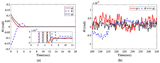 Then, the estimated attitude angle and the estimated attitude angular velocity converge to a steady state within a fixed time. According to Theorem 1, the observer dynamic error is asymptotically stable. Therefore, the satellite attitude system asymptotically stabilizes.