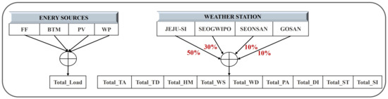 Our energy consumption data was collected from four primary energy sources such as fossil-fuel-based energy (FF), behind-the-meter (BTM), photovoltaic (PV), and wind power sources (WP). We denoted our actual energy data as Total_Load in MW, which were used for target variables. Jeju Island has four regions, the so-called JEJU-SI, SEOGWIPO, SEONSAN, and GOSAN. Each area has its own weather station that provides nine weather features. As we used Total_Load for the whole Jeju Island, we also aggregated all weather information by averaging the percentages of the whole island corresponding to each region. Accordingly, 50% of JEJU-SI, 30% of SEOGWIPO, 10% of SEONSAN, and 10% of GOSAN data were used. Therefore, nine weather features were considered: three temperature features, including the average temperature (Total_TA), the temperature of dew point (Total_TD), and the sensible temperature (Total_ST) measured in degree Celsius (C), the humidity (Total_HM) in %, the wind speed (Total_WS) in m/s, the wind direction degree in degree (), the atmospheric pressure on the ground (Total_PA) in hPa, the discomfort index (Total_DI), and the solar irradiation quantity (Total_SI) in (Mj/m). The source information of collected load and weather data is described in Figure 1.