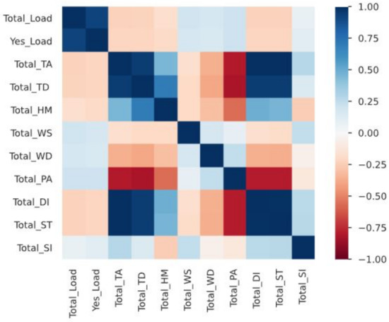 In terms of CV in Table 1, all input variables except Total_SI obtained CV values less than 1, meaning a low variance in the data. However, the last variable had a high variance, showing a 1.67 CV value. To better understand the data, the correlation coefficient () of Spearman was determined to catch nonlinear monotonic correlation between two variables, as represented in Figure 2. It indicates a value between −1 and +1 and assumes a negative is negatively correlated, while a positive one is positively correlated. There is no correlation between the two variables if the correlation coefficient is zero. Regarding the correlation diagram, Total_Load has a positive correlation with Yes_Load and vice versa. It is negatively correlated with Total_TA, Total_TD, Total_HM, Total_DI, and Total_ST, whereas there is close to zero correlation with Total_WS, Total_WD, Total_PA, and Total_SI. The Spearman’s rank correlation coefficient () can be formulated as follows: