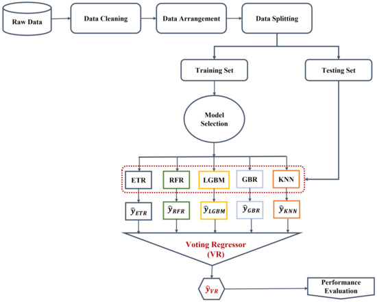 - The top five ML algorithms, namely ETR, RFR, LGBM, GBR, and KNN, that had minimum errors were selected and combined to build the proposed VR algorithm.