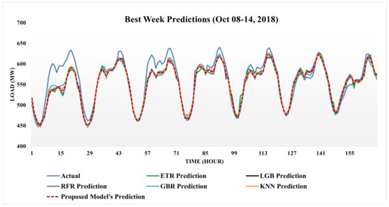 The difference between actual energy and predictions of all ML models for the best week is shown in Figure 4. The best week predictions of all models can be observed in the second week of October 2018. Thus, it is evident that predictions of all models perform very well. In the Figure, the actual energy and prediction of the proposed model are shown as a blue line and red dash line, respectively. In contrast, the predictions of other benchmark models are denoted as a green line for ETR, a black line for LGBM, a purple line for RFR, an aqua line for GBR, and an orange line for KNN. All models predict almost precisely the actual energy, although some gaps occur on 8 October and 10 October. The predictive load fluctuation varies from 450 MW to over 600 MW.