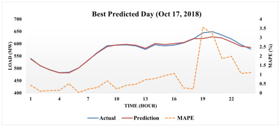 Moreover, the best predicted day was excluded from all tested days to explore how the minimum accuracy of our proposed voting regressor performs. It is presented in Figure 5, where individually, blue, red, and orange-dashed lines represent the actual energy, prediction, and MAPE, respectively. On 17 October 2018, the proposed model obtained an average MAPE of around 0.845%. MAPEs of less than 1% are achieved during the whole day, except for high MAPEs at night. Subsequently, our proposed model could improve the forecasting performance based on the generated relevant results.