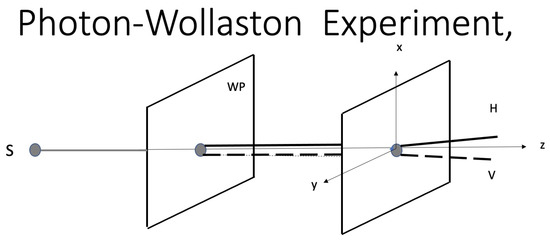 Figure 1 shows a basic quantum experiment related to spin as described in Feynman’s lectures. Photons are sent from a source S along the z-direction toward a Wollaston Prism that is typically shaped like a cube and is represented in the figure by a square in the - plane that is perpendicular to the z-direction. Through interactions of the photon with the material of the Wollaston symbolized by the shaded circle, the photon is sent either along the black line or the dashed line channel.