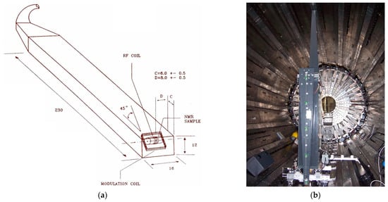 (a) Schematic view of a nuclear magnetic resonance probe. The probe external dimensions in mm (230 × 16 × 12), the position of an active volume (NMR sample) with a radio frequency (RF) coil, as well as the slope of a modulation coil, equal to 45° with respect to the probe axis, are shown. The NMR sample has a diameter of 4 mm and a length of 4.5 mm and is made of either a solid material containing a large amount of hydrogen or a sealed glass tube containing D2O. The measured magnetic field direction can be transverse or axial; (b) Automated field-mapping machine [8] for measuring the CMS magnetic field, installed inside the barrel hadron calorimeter. A carriage made of aluminum alloy moving by steps of 0.05 m along the rails aligned with the Z-axis, a tower made of durable non-magnetic material, two propeller arms rotating by steps of 7.5° along the azimuth angle in the forward and backward directions, and five 3D B-sensors on the propeller arm viewed from the positive Z-coordinates are visible.