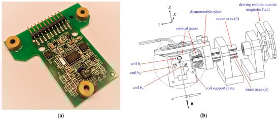 A calibration of the 3D B-sensors to a precision of 5 × 10−4 [10] has been performed by rotation of a package of four PCBs in a constant, homogeneous magnetic field at different absolute field values and temperatures [17,18,19]. A special calibration device shown in Figure 2b was designed and manufactured at CERN for this purpose. The calibrator rotated a small head in three constant values of the homogeneous magnetic flux density B in two orthogonal angular directions θ and φ with help of stepping motors located outside the magnetic field and a special transmission consisted of the long inner and outer axis and conical gears. The head was rotated in a thermostat box where a constant temperature was maintained by a Peltier thermoelectric element, and the cooling air flow was controlled by a fan. The middle plate of the head contained three orthogonal coils b1, b2, and b3 to measure the magnetic flux density components by the magnetic flux integration in each coil in the head local reference frame shown in Figure 2b. On each side of the coil support plate, two B-sensor PCBs were installed.