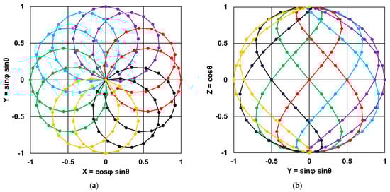 Trajectories of the magnetic flux density unit vector in the calibrator head local coordinate system: (a) in the XY-plane; (b) in the YZ-plane. Different colors correspond to six complete turns of the calibrator head with the outer axes. Markers denote the increments of 9.375° in azimuth φ and 11.25° in polar θ angles used to prepare the plot.
