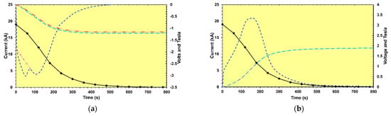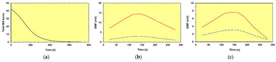 An upgrade of the flux loop measurement system carried out in 2013/2014 allowed one to perform in 2015–2018 a new set of measurements [30,38]. To induce the voltages in the flux loops, seven linear discharges from a current of 18.164 kA to 0 kA were per-formed as shown in Figure 13a.