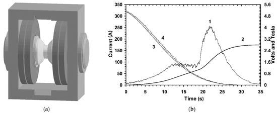 (a) 3D model for the test magnet with the steel sample disk inserted between the pole tips [12]; (b) Induced voltage (curve 1) and the integrated magnetic flux density (curve 2) when the test magnet current ramped down from 320 A to zero during 32 s. Curve 3 shows the requested current from the control software. Curve 4 corresponds to the measured current read-back [12].