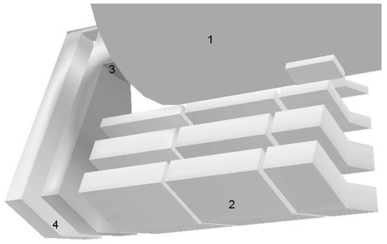 ELEKTRA model used for the yoke eddy current calculation [29]. CMS coil (1), the yoke sectors of the barrel wheels (2), nose disk (3), and two endcap disks (4) are presented in the model.
