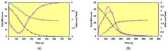 (a) Voltages calculated in the first flux loop on the L2 layer of the external barrel wheel when the eddy currents with realistic electrical resistances (dotted blue line with open diamonds) and infinite resistances (smoothed solid magenta line with filled diamonds) are modelled during the current fast discharge (black solid line with black circles). The dashed light blue line with open circles represents the result of voltage integration when the eddy currents exist. The solid red line with filled triangles displays the result of voltage integration in the model with eddy currents suppressed. The difference between two integrated magnetic flux densities is within 0.3%; (b) Voltages calculated in the middle flux loop on 18° segment of the D−2 endcap disk when eddy currents from realistic electrical resistances (dotted blue line with open diamonds) and eddy currents suppressed by infinite resistances (smoothed solid magenta line with filled diamonds) are modelled during the current fast discharge (black solid line with black circles). The dashed light blue line with open circles represents the result of voltage integration when eddy currents exist. The solid red line with filled triangles displays the result of voltage integration when eddy currents are suppressed. The difference between two integrated magnetic flux densities is within 2.8%.