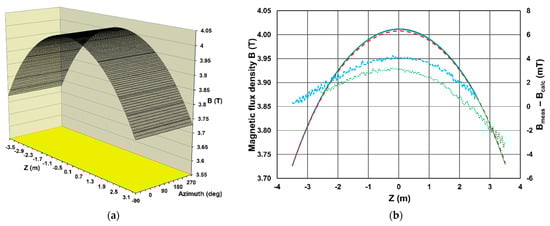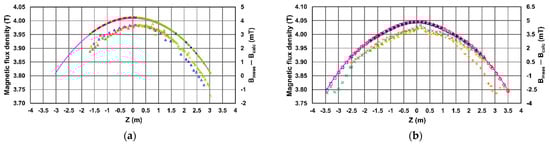 (a) Magnetic flux density measured [8] at a radius of 0.092 m along the coil axis in the range of ±3.5 m with respect to the coil middle plane for full azimuth coverage; (b) Comparison [10] of the measured (smooth curves) and modelled (dashed curve) values of the magnetic flux density (left scale) averaged over the full azimuth angle range. The measurements have been performed with two B-sensors located at a radius of 0.092 m with respect to the coil axis on the negative (thick smooth curve) and positive (thin smooth curve) fieldmapper arms, respectively. The differences between the measured and calculated values (right scale) are shown by square and round dots, respectively.