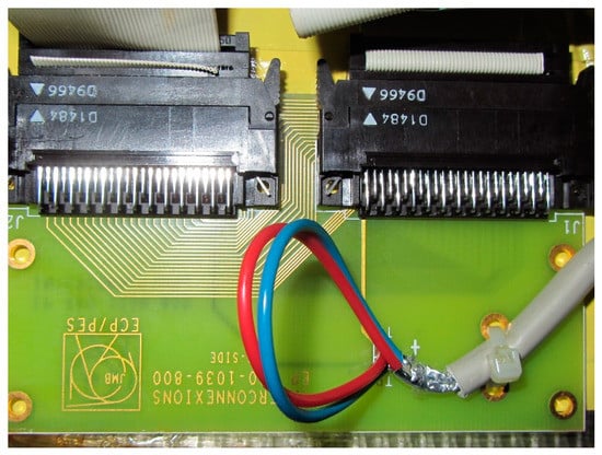 The flux loops on the barrel wheel blocks were wound in 16 grooves of 30 mm wide and 12 mm deep on the TC block and on three barrel wheel layers L1, L2, and L3 at the Z-coordinates of 0, −2.691, −4.244, −5.352, and −6.48 m. The flux loops on the endcap disks D−1 and D−2 were wound in 6 grooves of 30 mm wide and 13 mm deep at the Y-coordinates of −2.8, −4.565, and −6.235 m. The loops have 7–10 turns of the 0.635 pitch flat ribbon cable reduced from fifty AWG 30 wires to 46 wires, 45 of which are used to form each loop. A special PCB shown in Figure 11 has been designed to form each flux loop by connecting 45 wires on both ends of the cable using 3MTM 1.27 mm pitch wiremount sockets, boardmount right angle plugs, and a special scheme to offset the individual conductors in the ribbon by one conductor at the ends of the cable. Two free wires at the ends of the cable related to the differential analog input of the AD-USB readout module from Measurement Computing [34]. The modules were attached by the USB cables to two network enabled AnywhereUSB®/5 hubs [35] connected to a PC through 3Com® OfficeConnect® Dual Speed Switch 5 [36] sitting on the network cable.