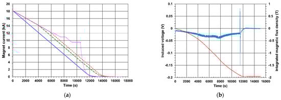 The third magnet discharge, on 10 September 2016, was similar; however, the current at which the rate transitioned from 1 to 1.5 A/s was 12.48 kA. Changing the current rates was required by the cryogenic system operational conditions. In both these magnet ramp downs, the fast discharges were triggered from a current of 1 kA, and the offline integration of the induced voltages was performed over 17,000 s [30].