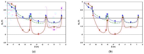 (a) Magnetic flux density (left scale) measured [8] with the NMR probe (rhombs) along the coil axis in the range of Z-coordinate from −1.675 to 3.025 m and calculated (smooth line) with the magnet model version 16_130503 [1]. The difference between the measurements and calculations (right scale) is shown by triangles. Different colors correspond to 4 sets of measurements; (b) Magnetic flux density (left scale) measured [8] with the NMR probe (rhombs), B-sensor of negative arm of the fieldmapper (open squares), and B-sensor of positive arm (open circles) all located at the radius of 1.724 m. The measurements are compared with the modelled values (smooth lines). The differences between the measured and calculated values (right scale) are shown by filled triangles, slanted and right crosses, respectively.