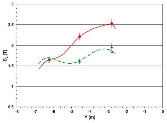 Radial magnetic flux density measured at B0 of 3.81 T (filled markers) and modelled (open markers) versus the Y-coordinate in the D−1 (diamonds) and D−2 (triangles) endcap disks. The lines represent the calculated values along the lines across the centres of the flux loops.