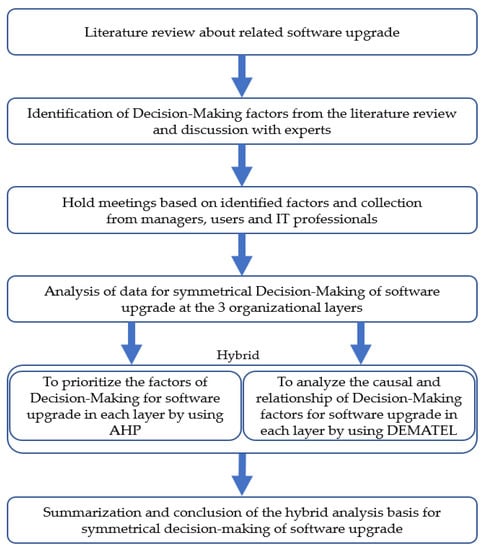 For this study, a research framework is proposed as shown in Figure 1. The study consisted of three steps to analyze the symmetric decision-making factors for software upgrade in the three layers of organization. In particular, the AHP and DEMATEL hybrid basis technique was used to determine priority based on the weight of each decision-making factor and to analyze the degree of influence. In the first step, the existing literature related to software upgrades was reviewed and factors were identified. To this end, brainstorming meetings were held with the relevant people, such as managers, users, and IT professionals. Additionally, the reliability of the identified factors was verified.