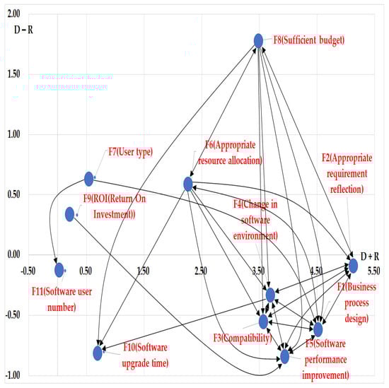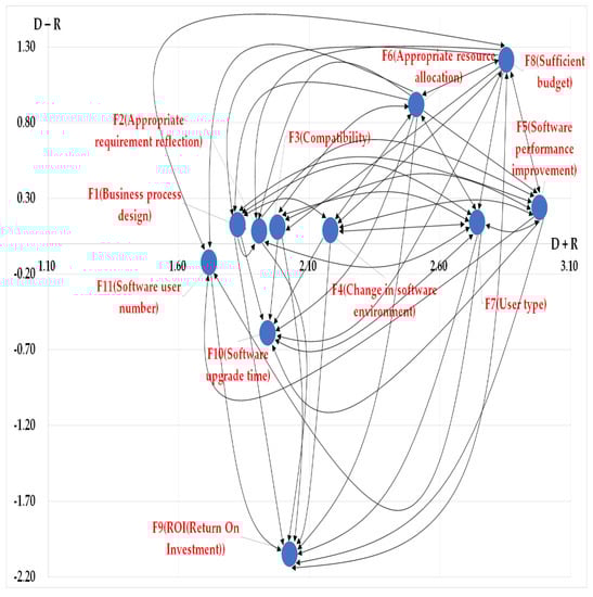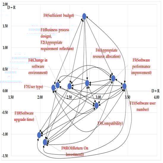 F1 (software design based on business process), F2 (appropriate requirement reflection), F3 (compatibility), F4 (change in software environment), F5 (software performance improvement), F10 (software upgrade time) and F11 (number of software users) were analyzed as an effect group affected by other factors among the factors with negative D − R values. In addition, as a result of analyzing the degree of impact effect, the factors were determined in the order of F5 (software performance improvement), F10 (software upgrade time), F1 (software design based on business process), F3 (compatibility), F4 (change in software environment), F11 (software user number) and F2 (appropriate requirement reflection).