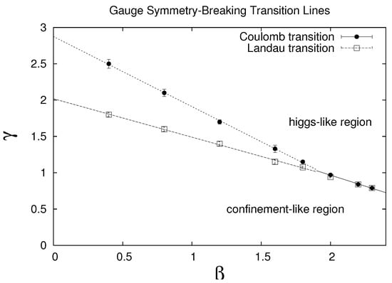 Starting with the first question, most discussions of the Higgs mechanism begin with a “Mexican hat” potential of some kind, and the Higgs field is expanded around one of the minima of this potential, i.e., , where the particular minimum is selected by fixing to a unitary gauge. When this replacement for is inserted back into the action, some or all of the gauge vector bosons acquire a mass. However, then we may ask: in what sense is this spontaneous symmetry breaking? Unitary gauge, for the U(1) and SU(2) groups, is a complete gauge fixing; once has been fixed, all gauge freedom has been removed. Thus, there is no gauge symmetry left to break, spontaneously or otherwise. Yet, one often speaks of a Higgs mechanism (“spontaneous gauge symmetry breaking”) occurring in such theories. Thus, perhaps, at least in connection with this issue, we should avoid gauge fixing? However, in the absence of gauge fixing, a local gauge symmetry cannot break spontaneously, as we know from Elitzur’s famous theorem. What about a middle way, i.e., choose some gauge, e.g., Coulomb, Landau, or axial gauge, which leaves a global subgroup (a “remnant” symmetry) of the gauge group unfixed? A global symmetry can break spontaneously. This is perfectly consistent with Elitzur’s theorem, and some textbooks and review articles (e.g., [7,8]) do define “spontaneous gauge symmetry breaking” in this way. The problem with this idea is that the location of the transition line is gauge-dependent [9]. This is seen in Figure 1, where transition lines for the breaking of the global remnant symmetry were computed in SU(2) gauge Higgs theory in both Coulomb and Landau gauges. (There are also suggestions that photons, or in general massless gauge bosons, are the Goldstone bosons of a spontaneously broken remnant gauge symmetry that exists in covariant gauge, i.e., it is the massless phase which is the phase of a spontaneously broken gauge symmetry. See Guendelman [10] and references therein.)