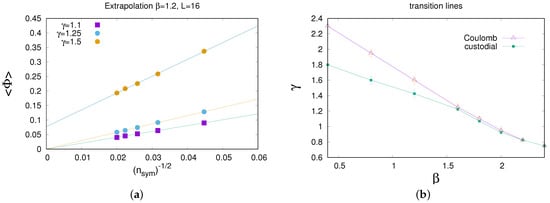 Having computed at a variety of values, the last step is to extrapolate the data to , as shown in Figure 2a. At couplings inside the unbroken phase, the data extrapolates to zero. In the broken phase, extrapolates to a non-zero value. (Of course, on a finite lattice, the order parameter always vanishes for , and what that means numerically is that, without the explicit term breaking term proportional to h, for large enough, eventually the data points would depart from the extrapolated line derived from the lower values, and fall to zero. However, this departure towards zero, in the broken phase, would occur at ever larger values of , as the lattice volume is increased.) One can estimate the point at which the transition from a zero to non-zero value occurs, and this is the transition point. The figure shows some sample extrapolations in SU(2) gauge Higgs theory at several values, on a lattice, with is held fixed at . By this procedure, one arrives at a transition line (green data points) shown in Figure 2b. The upper line is the transition line for spontaneous breaking of the “remnant” symmetry, which is left unfixed in Coulomb gauge. This line lies above the breaking of custodial symmetry determined by the order parameter , in conformity with Theorem 1, i.e., custodial symmetry may be broken where remnant symmetry in an F-gauge (such as Coulomb) is unbroken, but not the other way around. (One should keep in mind that is really the expectation value of a highly non-local quantity, namely , where is the gauge transformation to the F-gauge.)