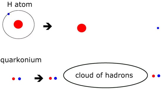Let us start with a (superficially) silly question: what is the binding energy of the proton? Or the J/, or any hadron. Obviously, unlike the hydrogen atom, we cannot ionize a proton, or quarkonium, at least experimentally, and compare the energies of the bound and ionized states. Instead of an isolated quark and antiquark, we instead obtain a bunch of color neutral hadrons (Figure 3) with integer electric charges. (Figure 3 and Figure 4 of course picture a mesonic quark–antiquark state, but the picture is similar for baryonic states.)