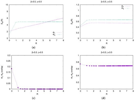 Contrasting properties of charged () and neutral () fermion–antifermion states in the confinement and Higgs phases of an SU(3) gauge Higgs theory. (a) Energy expectation value vs. separation R of the and states in the confined phase, . (b) Same as subfigure (a), but in the Higgs phase at . (c) Overlap vs. R of normalized charge () and neutral () states in the confined phase, at . (d) Same as subfigure (c), but in the Higgs phase at . Figures from ref. [15].