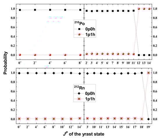 In Figure 2, we present the probability of neutron 1p1h excitations across the shell gap in the yrast states, as well as the probability of the closed-shell state. In our calculation, the contributions of neutron 2p2h configurations in the discussed low-lying states of Po are all negligible. According to the results of Figure 2, we classify the yrast states into three cases as follows and present them in three colors in Figure 1.