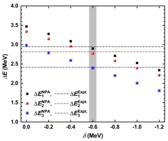 Similarly, in the lower panel of Figure 1 for Rn, one sees that although the calculated energy levels of Case 1 (in particular, the negative-parity ones), i.e., those of , , …, and those of , , , , …, , , are lower than corresponding experimental data, the relative level spacing given by the calculation is very similar to that given by experimental data. The calculated ’s with , which are equal to (1.05, 1.29, 1.39, 1.38, 1.46, 1.38, 1.76), are very close to the experimental values (1.07, 1.35, 1.45, 1.45, 1.50, 1.47, 1.85).