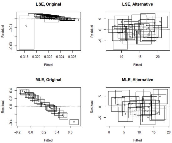 The best result of the extreme value from the numerical experiment is selected as the estimate. The integration in the least-squares method is done using the function, whereas the numerical derivation calculation in the MLE method is done using the function of the package (version 2.2.5) [28]. Refer to Table 3 for the results of the parameter estimation as well as the mean and standard deviation of the residual analysis. In this table, ‘RLSE’ stands for the weighted least-squares method from [14], ‘LSE’ stands for the least-squares estimation, and ‘MLE’ stands for the maximum likelihood estimation. ‘Original’ means that the fitted model is a Box-Cox model, ‘Alternative’ means that the fitted model is an alternative Box-Cox model, and ‘Transformed’ means that after fitting the alternative Box-Cox model, the estimation results are reparameterized to be compared with that of the Box-Cox model. The residual plot is shown in Figure 1. In this figure, ‘LSE’ stands for the least-squares estimation, ‘MLE’ stands for the maximum likelihood estimation, ‘Original’ stands for the Box-Cox linear model, and ‘Alternative’ stands for the alternative Box-Cox linear model.