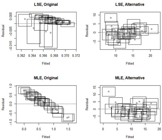 The residual graph, as well as the mean and standard deviation of the residuals, remains useful here for residual analysis. The optimization, integration in the LSE and numerical derivation in the MLE are again carried out via the function, the function and the function, respectively. The parameter settings are explored as are those of the previous linear case. Please refer to Table 5 for the parameters details and Table 3 for the results of the parameter estimation with the mean and standard deviation. The residual plot is presented in Figure 2. In this figure, ‘LSE’ stands for the least-squares estimation, ‘MLE’ stands for the maximum likelihood estimation; ‘Original’ stands for the uncertain Box-Cox Michaelis–Menten kinetics regression model, and ‘Alternative’ stands for the alternative uncertain Box-Cox Michaelis–Menten kinetics regression model.