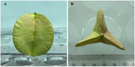 Given that the conspecific morphological variation in plant organs (e.g., leaf shape) mainly results from genetic differences (between cultivars) rather than differences in the growing environment [11], we randomly sampled 100 fresh pieces of fruit from six adult golden rain trees (K. paniculata) of the same population growing on the Nanjing Forestry University campus (32°08′20″ N, 118°80′84″ E) from 8–9 October 2021. In China, the tree is naturally distributed in the lower reaches of the Yellow River and the Yangtze River, including the studied site. We chose to sample fruit in early October as the fruit was mature, and some had even fallen to the ground from the sampled trees. The collected fruit was then quickly brought back to the laboratory and photographed using the camera of an Apple iPhone 11 with 3024 × 4032 pixels. Each fruit was placed vertically in a round hole in a plastic test tube rack (27.8 cm × 23.0 cm × 7.5 cm, radius = 2 cm) to keep the vertical axis through the fruit petiole to the fruit tip approximately perpendicular to the horizontal surface of the rack (see Figure 1 for an example). To reduce measurement error, we photographed the fruit one at a time while arranging a transparent plastic ruler around each piece to measure its actual scale. The mean distance from the lens of the camera to the fruit averaged 15 cm.