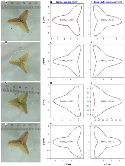 Four sample vertical projections of K. paniculata fruit (A,D,G,J), and their fitted outlines predicted by the GE (B,E,H,K) and by the TGE (C,F,I,L). For the panels in the second and third columns from the left, the gray curves are the scanned outlines of fruit projections, and the red curves are the outlines predicted by the GE (second column) and by the TGE (third column).