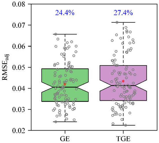 Comparison of adjusted root mean square errors (RMSEadj) between the GE and TGE. The percentages above the uppermost whiskers represent the coefficients of variation of the RMSEadj values for each equation. The GE and TGE correspond to Equations (7) and (8), respectively, in the text.