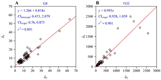 Linear regressions of the estimate of n3 vs. that of n2 in the GE (A) and in the TGE (B). CI represents the 95% confidence interval. The number of data points plotted in each panel is 100.
