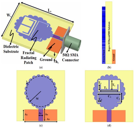 Figure 1 represents the aspects covering all the optimized dimensions in the implementation of a fractal antenna (FA). As observed from Figure 1a, the antenna had a compact dimension of Ws × Ls mm2 where a Rogers RTDuroid5880 microwave substrate of thickness hs mm was used with electrical properties including εpermitt. = 2.2 and tan δ(loss tangent) = 0.0009. A fractal radiation patch was available on the front plane of the microwave substrate used in the current design and on the opposite side to a rectangular ground plane. The signal was fed to the antenna via a microstrip feed line that offered 50 Ω of impedance and a sub-miniature A connector was used with a feed line for the supply of the signal from an external source, which characterized the antenna in the S-parameter and far-field area. The side view is shown by Figure 1b with the thickness of the copper taken as 0.035 mm. Figure 1c signifies the design of a fractal radiator with the front view showing a radiating patch with no notched filters. The radius of the circular radiating was calculated by using Equations (1)–(3) given below, as adapted from [41].