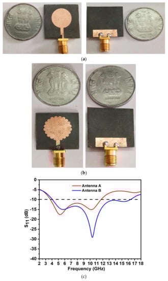 Development of a solo unit cell without interfering bands: (a) prototype of Antenna A; (b) prototype of Antenna B; (c) measured S-parameters.