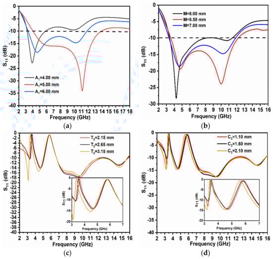A parametric analysis of the key parameters played an important role in not only optimizing the intended design but also achieving a useful bandwidth. In this parametric study, a variation of the length of the ground (A1 in mm), the radius (M in mm) of the patch circle and the effective length of the notched bands were changed to observe the impact on the operational bandwidth and the change in the position of the centered notched band frequencies. Figure 3a shows the changes in the impedance bandwidth when the length of the ground plane was varied. As per the observation, A1 varied from 4.00 to 6.00 mm and there was an improvement in the matching of the impedance; for A1 = 5.00 mm, the intended impedance bandwidth of 4.05–13.93 GHz was achieved. Similarly, when the patch circle radius (designated as M) observed a variation between 6.00 and 7.00 mm, there was a change in the upper cut-off frequency. The value of M = 6.50 mm achieved a desirable operating frequency band of 3.56–12.17 GHz with the best matched impedance.