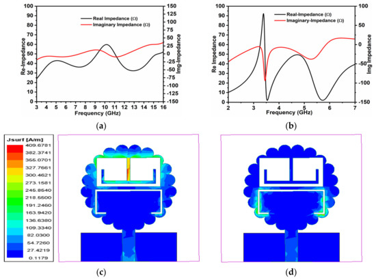 (a) Real and imaginary impedance (exclusion of filters); (b) real and imaginary impedance (inclusion of filters); (c) the impedance of the antenna with filtering bands; (d) the distribution of the current density on the surface at 3.45 and 5.70 GHz, correspondingly.