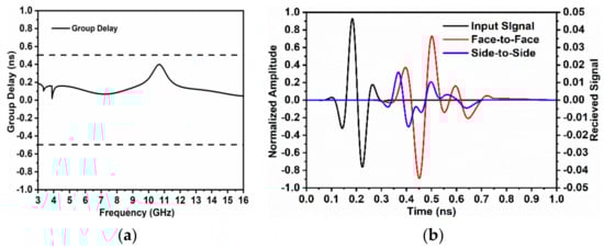 The degree of distortion of the pulse was evaluated by studying the group delay. Figure 5a shows the group delay of the proposed antenna, which signified that the variations were less than 0.2 ns for the bandwidth of 3–9 GHz and fewer than 0.5 ns for the remaining operating bands. The impulse response given as the input for the transmitter in both alignments (face-to-face and side-to-side) is depicted in Figure 5b. A Gaussian pulse was applied at the transmitting antenna. It was observed that in the face-to-face orientation, larger amplitude signals were received compared with the side-to-side alignment as expected.