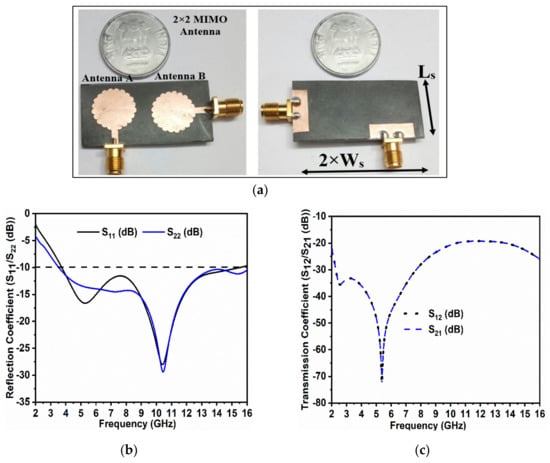 In Section 3, a single unit cell characterization was designed and analyzed and the solo antenna was transformed to a two-port MIMO configuration to increase the efficiency and also to encounter multiple fading effects. Figure 6a shows the proposed fabricated two-port MIMO arrangement, which was a result of placing two identical radiators in an orthogonal manner with a spacing of λ/2 between them. As per the observation, there was an absence of an additional decoupling element with a better separation of the transmission coefficients. The antenna dimension of the new MIMO configuration was Ls × 2Ws mm2. Figure 6b shows a plot of the S-parameters for both the reflection and transmission coefficients. The S-parameters play a vital role in achieving the characteristics of the MIMO antenna as all these above parameters are useful in the calculation of the diversity characteristics for the designed radiator. The bandwidth was also calculated from the obtained S-parameters. For both the radiating patches, the S11/S22 parameters achieved the intended −10 dB operational bandwidth and filtered the WiMAX and WLAN frequency bands. As per the depiction in Figure 6b, the antenna offered a better isolation of −20 dB in the bandwidth of interest providing an acceptable diversity performance.
