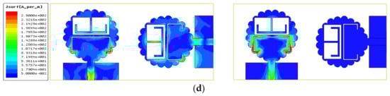 Figure 6c,d observes the distribution of the current density on the surface, which was simulated for 3.54 and 5.53 GHz, respectively. This simulation was carried out by matching the port of Antenna B and providing an input to Antenna A. As per the observations, a conclusion was derived that the distribution of the current density on the surface was observed inside the T-type inverted stub and the outer boundary of the C-type slot. This again led to the conclusion that a highly mismatched impedance occurred and, hence, the input signals were reflected leading to the notched band characteristics as observed from the S11/S22 graph.