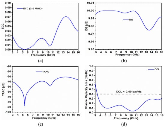 For the MIMO radiating system, the DG 2×2 values should be more than 9.95 dB. As per the observation in Figure 7b, in the entire operating bandwidth of interest, the recorded values were DG 2×2 > 9.97 dB.