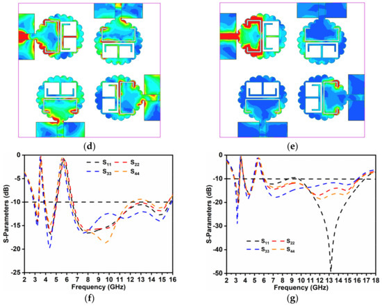 In the previous section, the characterization of the 2 × 2 MIMO configuration was discussed. To achieve a higher data rate of transmission, the proposed 2 × 2 MIMO was transformed to a MIMO (4 × 4) arrangement by the addition of two more identical radiating patches that were located orthogonally with respect to each other, as observed in Figure 8a. The proposed MIMO antenna occupied a compact space with antenna dimensions of 2Ls × 2Ws mm2, designed on a Rogers RTDuroid5880 substrate (Figure 8b,c). Figure 8d,e shows the surface density of the current circulation at 3.52 and 5.58 GHz. It was noted and observed that the circulation of the current density on the surface accumulated inside the inverted T-alphabet structure for the WiMAX filter and around the C-alphabet etched structure in the case of the WLAN filter. This indicated that these two notched bands offered a higher change in the impedance and, hence, resulted in the non-radiation of the input signals. Figure 8f depicts the scattering parameters for the notched filter-designed antenna. It was observed that the required bandwidth with the notched bands was achieved by noting the S11/S22/S33/S44 S-parameters. Figure 8g shows the measured S-parameters (reflection coefficients), which had a good agreement with the simulated results. The Anritsu VNA (model number MS2038C) was used for the S-parameter measurement and an anechoic chamber with a capacity of 20 GHz was used for the far-field measurements.