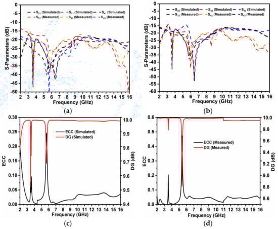 The above equation calculates the DG for a 4 × 4 MIMO antenna configuration. For any MIMO configuration, DG > 9.95 dB; in the reported work, both the simulation and measuring values corresponded well above 9.95 dB except in the notched bands, as observed in Figure 9c,d.