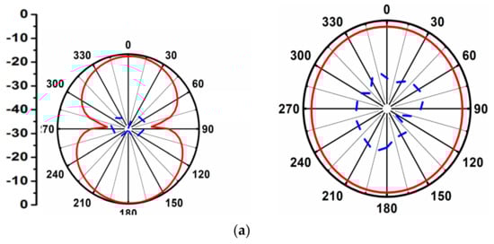 Figure 11 shows the measured radiation pattern of the reported work in the principal E- and H-planes. As per the observation, the antenna offered a di-pole-like pattern and an omnidirectional pattern, which were required for the operation of the proposed antenna. These radiating patterns were observed and measured at 4.50, 6.85 and 11.0 GHz.
