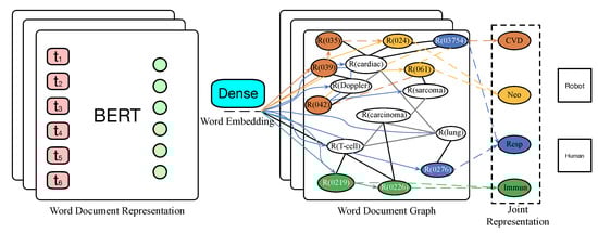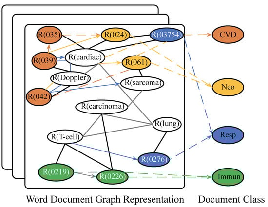 Text GCN is as follows [28]. A document is a node that begins with “O”, and a word node is another node. The edges of the document are thick black edges and thin grey edges. The representation (embedding) of x is represented by R(x). Different document classes are represented by different colours (only four sample classes are shown to avoid confusion). CVD: cardiovascular disease; Neo: tumours; corresponding: respiratory diseases; Immun: immune diseases.
