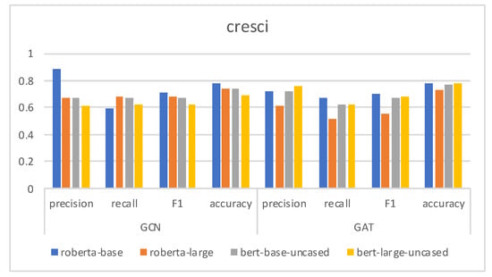 Figure 4, Figure 5, Figure 6, Figure 7 and Figure 8 presents the various evaluation indicators of each model. We can see that BGSRD and RoBERTaGCN perform the best across all datasets. Using BERT or RoBERT with GCN generally performs better than using them with GAT, except for Gilani, which is due to content posted by social bots having the characteristics of propagation, while GCN can learn the propagation characteristics of fake content. Roberta-base and roberta-large improve the performance on datasets more significantly than bert-base-uncased and bert-large-uncased. The main reason for this is that the average length in the dataset is relatively long: long text may produce more document connections transmitted through intermediate word nodes because of the graph constructed by word document statistics and, at the same time, the messages transmitted by the graph will be more favorable to passing, and the performance will be better when combined with GCN. On cresci, botometer, stock and midterm datasets, the reason the GCN model performs better than the GAT model can be explained; compared with other datasets, datasets with shorter documents (such as Gilani) have less performance improvement because the ability of the graph structure is limited. BERTGAT and RoBERTaGAT also benefit from the graph structure. Their performance is not as good as that of the GCN variant because of the lack of edge weight information.